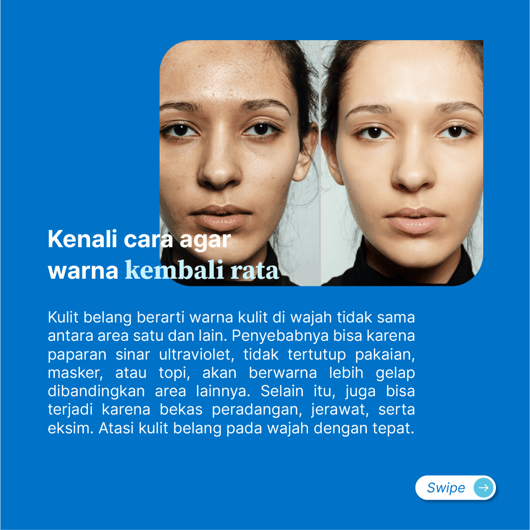 Kulit belang dapat mengganggu penampilan dan menurunkan kepercayaan dirimu. Ada berbagai cara dan produk perawatan kulit untuk tangani masalah ini. Supaya perawatanmu berjalan efektif dan membawa hasil yang optimal, kamu bisa berkonsultasi dengan dokter.