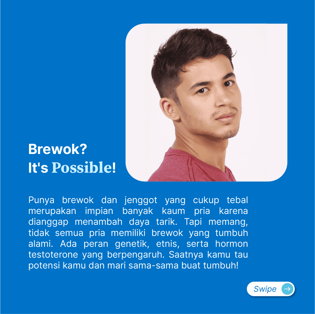 Punya brewok dan jenggot yang cukup tebal merupakan impian banyak kaum pria karena dianggap menambah daya tarik. Tidak semua pria memiliki brewok yang tumbuh alami. Ada peran genetik, etnis, serta hormon testoterone yang berpengaruh terhadap bakat seseorang memiliki brewok, termasuk kondisi tertentu misalnya alopecia areata. Karena penyebabnya berbeda-beda, kamu bisa melakukan konsultasi singkat dengan dokter sehingga kamu bisa mendapatkan treatment dan cara yang efektif untuk membantu menumbuhkan brewokmu.