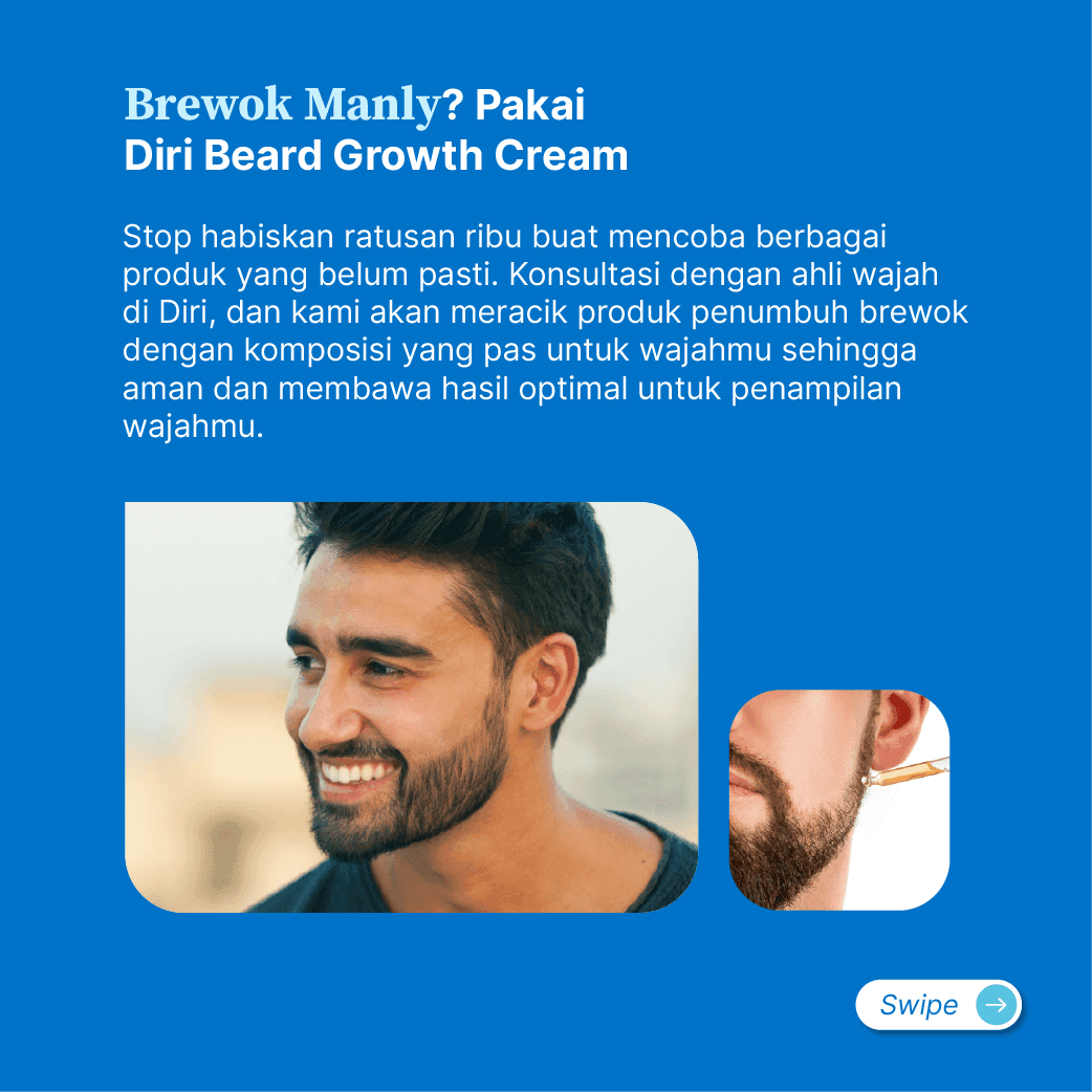 1. Solusi agar brewok tumbuh cepat dan terawat menggunakan produk dan kandungan yang 100% medical grade. Seperti Minoxidil, Finasteride, Retinoid, Kortikosteroid, Biotin, Zinc, dan Kreatin dengan kadar yang disesuaikan untuk kondisi dan penyebab keluhanmu.